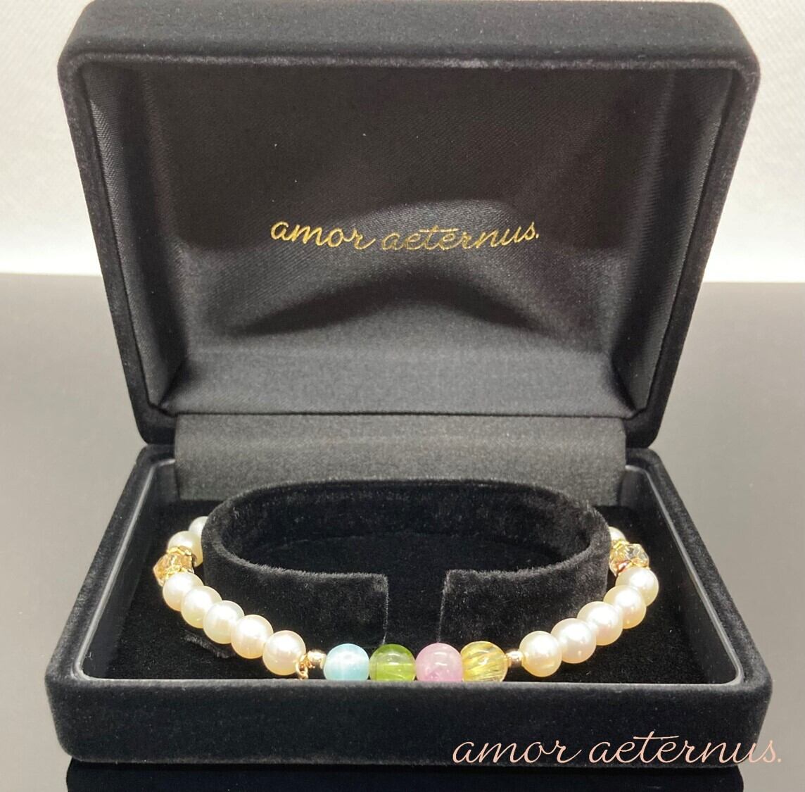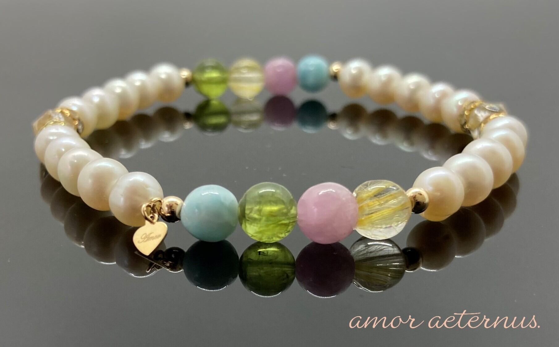 6mmで細身ですが豪華でカラフルな天然石と淡水パールの組み合わせ18金プレート・10金パーツが華やかな手元にしてくれます。